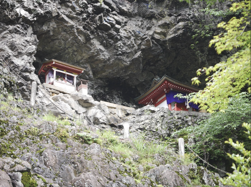 本堂 背後の岩壁が役行者が修行したと伝えられる般若窟