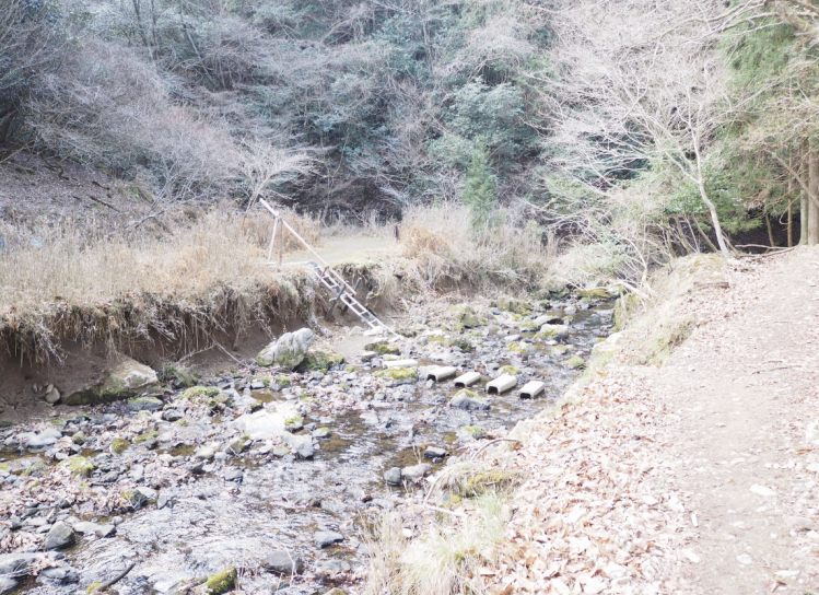 出灰川(ゆずりはがわ)をブロックの飛び石と脚立で渡渉