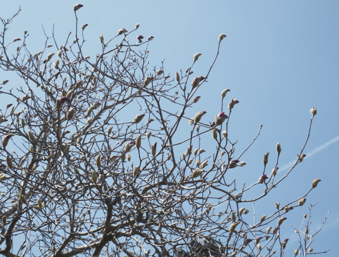 紫のコブシ 開きかけもあるけどほとんど蕾