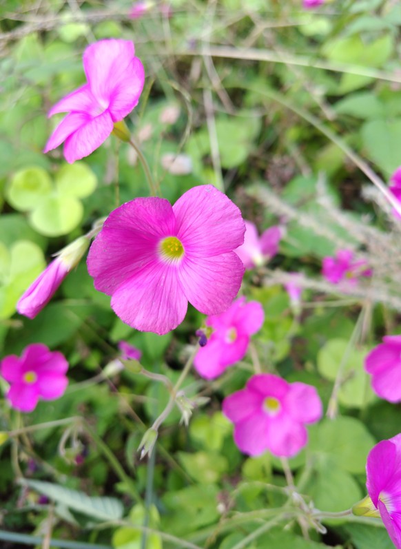 子供のころ住んでいた家(実家 No.2)の外周の除草や植木などの管理をしていて、ふと目についたのがこのピンクの花。そう言えば、小さいころ、これとよく似た花(これよりも小さい)の咲く植物を使って「相撲取り」ゲームなどをやっていたのを思い出します。その植物も同じように三つ葉をしていて、その茎から細い筋を引き出して、三つ葉と筋だけにして、それをからめて切れなかったほうが「勝ち」というわけです。また、その茎を噛んでみると酸っぱい味がして、「けっこう美味しい」などと言いながら口に含んだり…。調べてみると、小さい花も最初の大きな花もいずれも「カタバミ」という種類のようです。花が大きいほうが「ハナカタバミ」、小さいほうを「イモカタバミ」というのだとか。